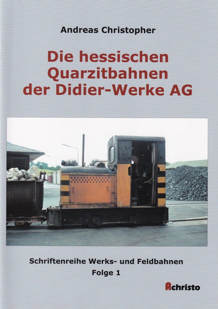 Für ihre Silika-Produktion in Mainzlar betrieben die Didier-Werke AG in Hessen bis in die 1980er Jahre mehrere Quarzitbrüche, in denen Feldbahnen zum Einsatz kamen. In dieser Broschüre werden die Geschichte des Stammwerks Mainzlar mit seiner normal- und schmalspurigen Werksbahn und die Feldbahnen in Leimsfeld, Merzhausen und Sterzhausen beschrieben. Dokumentiert werden die Betriebe jeweils mit ausführlichen Texten, Skizzen, Loklisten und zahlreichen Fotos, fast ausschließlich in Farbe.