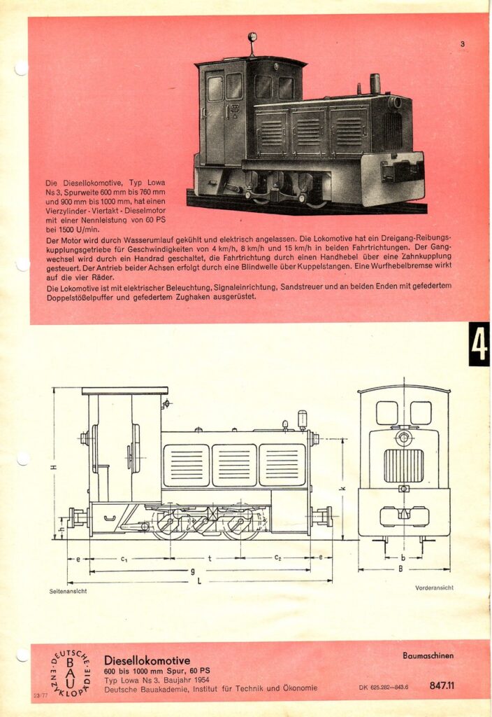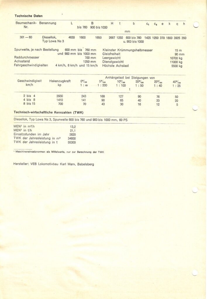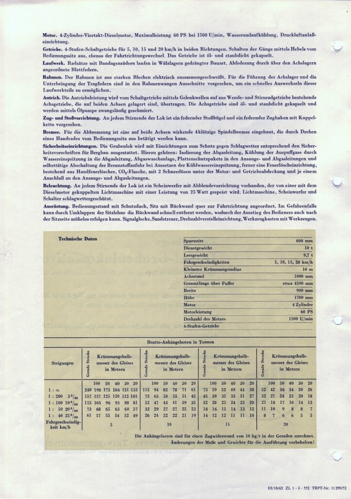 Die Maschinen waren mit einem wassergekühlten Vierzylinder-Viertakt-Dieselmotor mit 60-PS Nennleistung ausgestattet, das Dienstgewicht war mit 11 Tonnen angegeben. Der Antrieb der Außenrahmenlok erfolgte mittels eines mechanischen dreistufigen Rädergetriebes mit Reibungskupplung über eine zwischen den Achsen liegende Blindwelle und Stangen auf die Achsen. Die Geschwindigkeit der drei Gänge betrug 4, 8 und als Höchstgeschwindigkeit 15 km/h. Die Hauptmaße waren LüP 4630 mm, Achsstand 1250 mm und Raddurchmesser 700 mm. Der kleinste befahrbare Radius betrug 15 m. Die Breite lag bei 1600 mm, für Spurweiten größer als 760 mm wurde eine verbreiterte Variante (1850 mm) hergestellt. Zunächst wurden die Maschinen mit Gleitlagergetrieben ausgestattet. Auf Grund der Störanfälligkeit der Gleitlagergetriebe wurden bei den späteren Lieferungen dann Wälzlagergetriebe eingebaut.