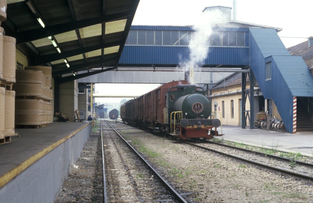 Dampfspeicherlok der Papierfabrik Neusiedler in Ulmerfeld-Hausmening am 13. September 1988.